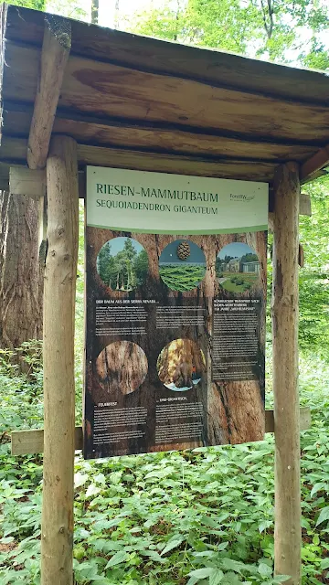 Unser Pausenplatz im Wald. Hier wurden 1930-40 jede Menge unterschiedliche Bäume eingepflanzt, um das Wachstum und Verhalten in dieser Region zu testen. Das Schild gibt Aufschluss über die Aktion.